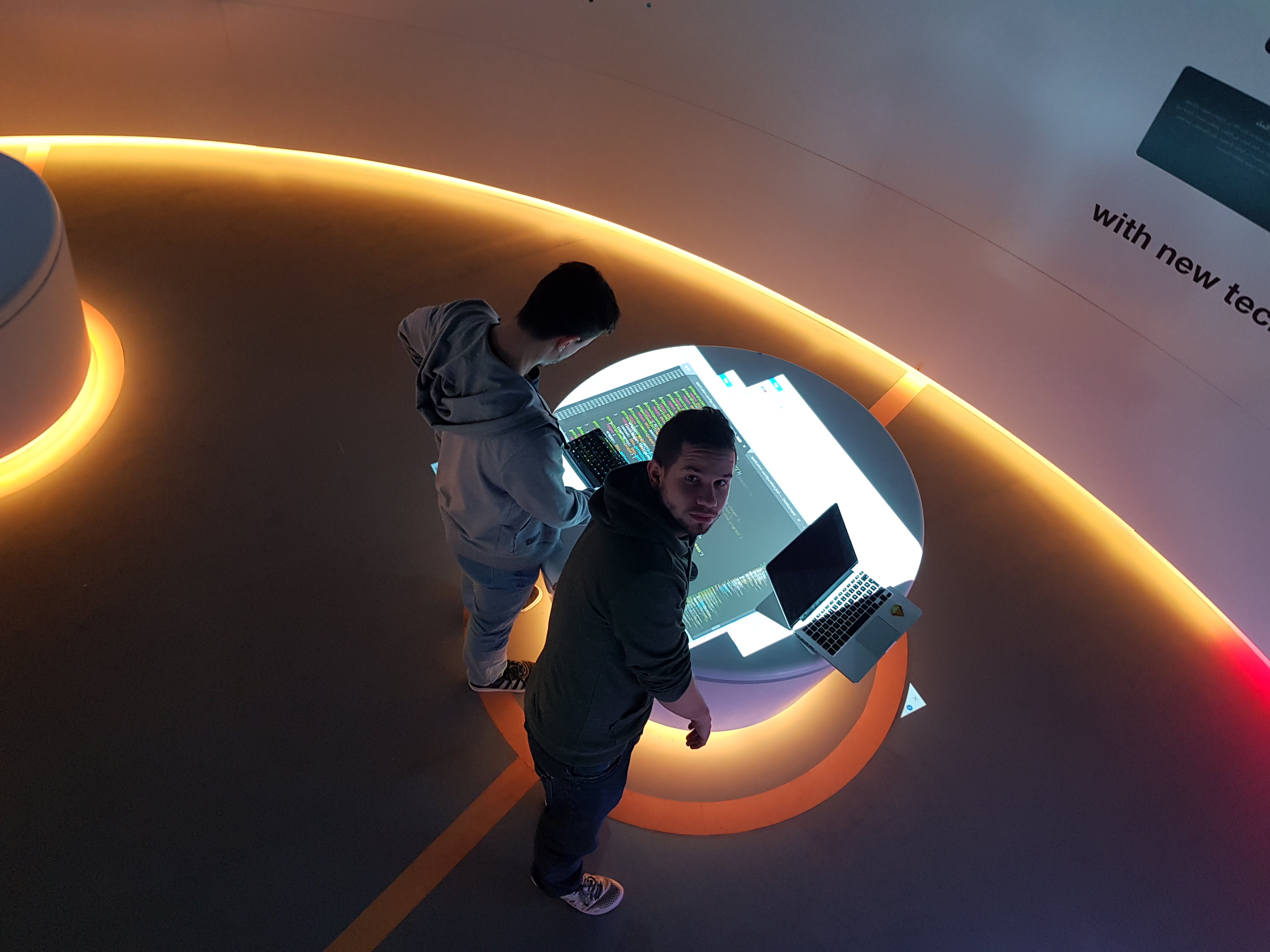 The exhibit needed to support multiple people simultaneously, therefore we needed to optimize the amount of data we send from the Kinect to the UI, as the streams that the sensor’s SDK creates are huge. Our Kinect detection algorithm triggered a movement event too frequently and we needed to throttle the number of bytes we transfer. The solution we introduced included processing the data and transferring it to the UI in an interval that did not create a delay for the user, but created a lot of headroom in the system for other calculations. As the number of movement events needed to be reduced, we also discovered that we needed to predict the user behavior and movement, so the change in the position on the screen wouldn’t be too linear and sharp – tracking the state of the positions of steps the user made and combining them with a transition resulted in a more realistic experience.