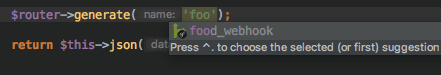 Pretty sweet, right? When you do give it a good route name, you can just cmd+click the string and PhpStorm will jump to the controller that implements the action. But that’s not all, it gets even better – as PhpStorm knows all your available routes, it will auto-suggest what to use.