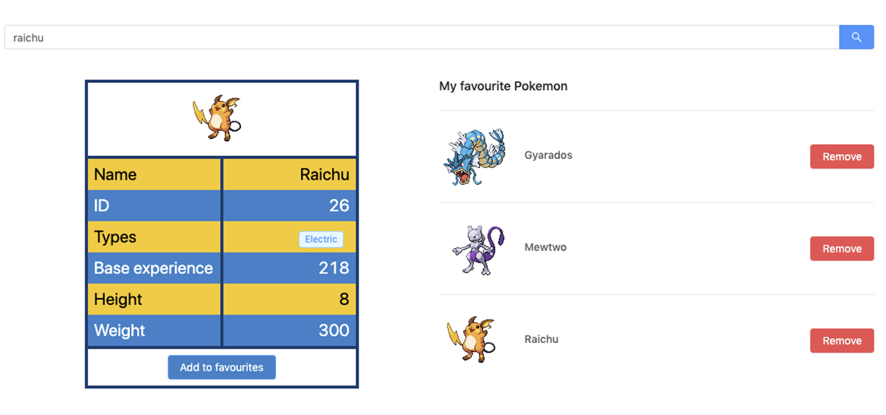 Here is an example of a screen you might see in the application. The search bar is connected to the PokeAPI and it allows you to search for Pokemon by their name or ID. After you’ve searched for a Pokemon, you can see its stats and also add it to a list of your favourite Pokemon. Afterwards, you can remove a Pokemon from the said list.