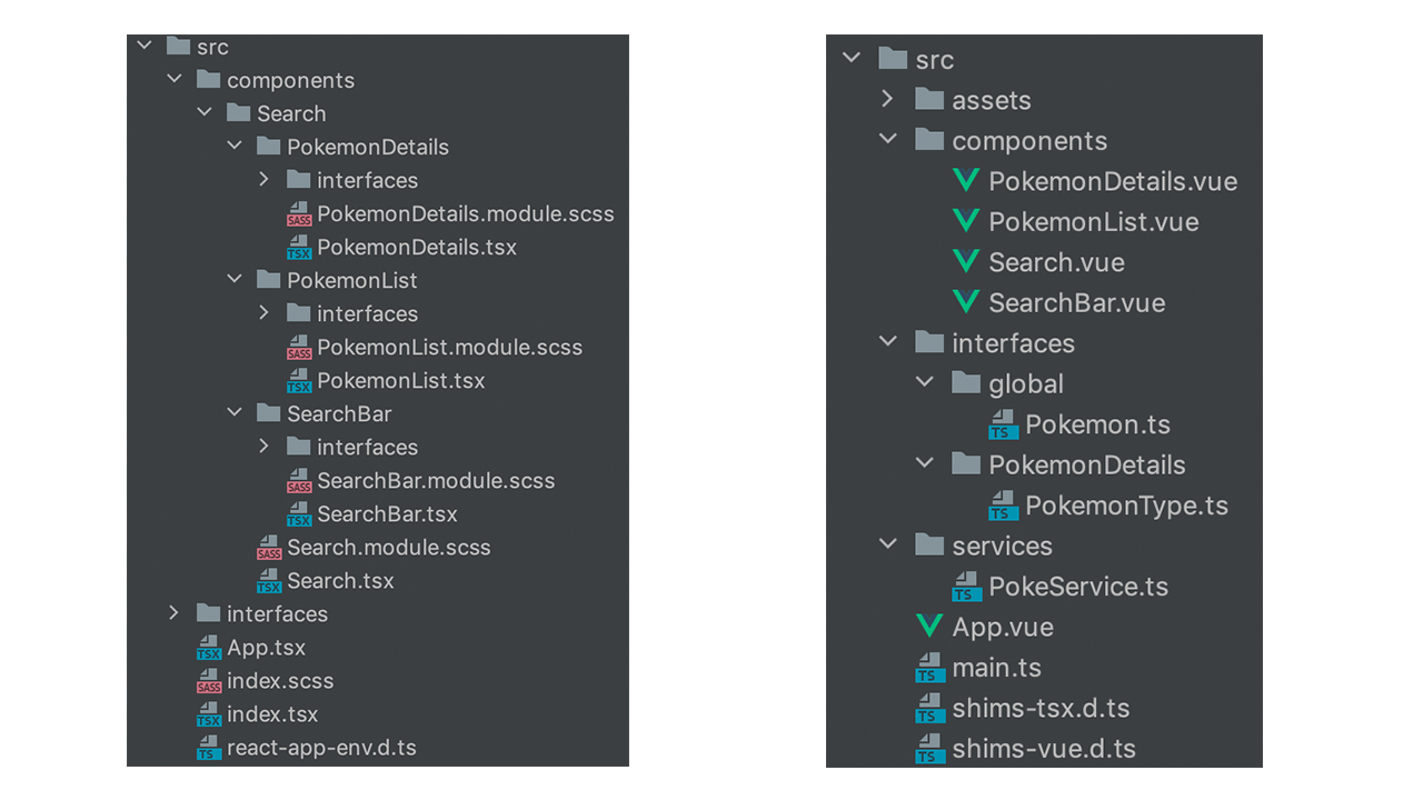 On the left is the React app (just the /src). As you can see most of it is the same as the Vue app, save for some default stuff generated by each app, ie. typings and .env. The only larger difference is that I made the interfaces folders for each component for React since they also hold the prop types.