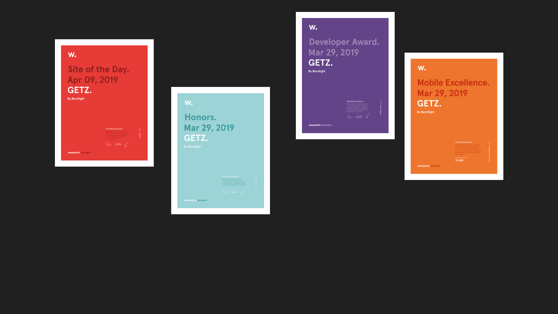 GETZ website won Site of the Day, Mobile Excellence, Developer Award and Honorable Mention from Awwwards, as well as Website of the Day, Best UX, Best UI and Best Innovation awards from CSS Design Awards.